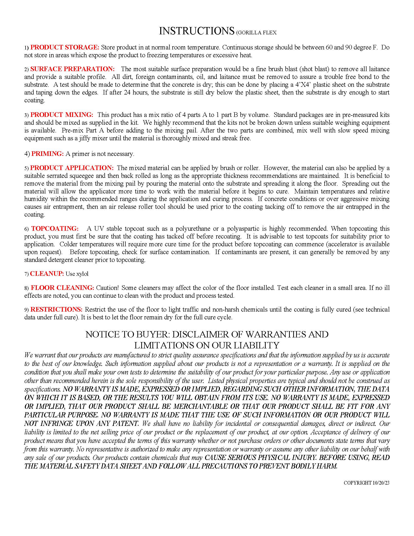 Gorilla Flex is available in 1.25-gallon, 2.5-gallon, and 5-gallon kits, perfect for jobs of any size. For the best results, use Gorilla Flex as a basecoat and top it off with a polyaspartic or polyurethane topcoat for long-lasting performance.